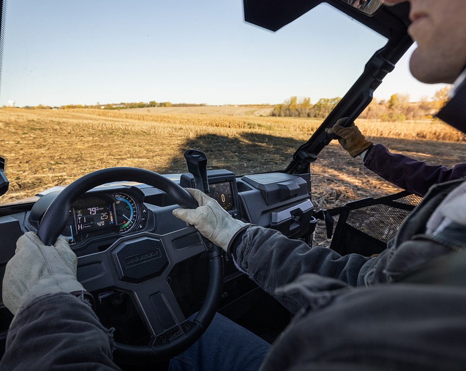 Cadran analogique à double balayage du côté du conducteur avec centre d'information du conducteur à cristaux liquides de 4 pouces à couleurs multiples : Consommation et régénération (%), état de charge de la batterie (%), autonomie restante, taux de charge, température de la batterie, température du moteur, tension des accessoires, compteur de vitesse, compteur kilométrique, compteur journalier, indicateur de vitesse, indicateur et codes d'entretien, intervalles d'entretien programmables, rappel de ceinture de sécurité, rétroéclairage et luminosité réglables par l'utilisateur, horloge. Sièges haut de gamme découpés et cousus avec dossiers profilés et marquage Polaris brodé, volant et garnitures intérieures haut de gamme, système électrique Polaris Pulse (6 positions), prises de courant continu, double port USB, port SAE 12 V situé dans la boîte à gants avec interrupteur marche/arrêt au tableau de bord.